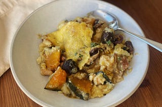 A polenta pie that's filled with saucy fall vegetables and a little bit of cheesy smoke